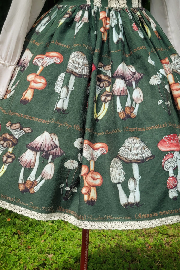 Inspired by the pages of a Victorian mycologist's notebook, this jumperskirt features a print of various mushroom species alternating with their common and Latin names. Artwork was originally hand done with watercolors.